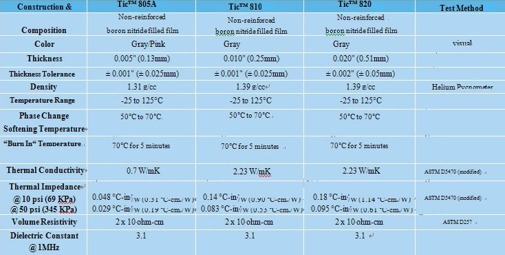 抽搐™ 800是一种高性能、非导电的相变材料。在50°;C、 Tic公司™ 805开始软化和流动,填充热溶液和组分的微观不规则性´;s表面,从而降低热阻。